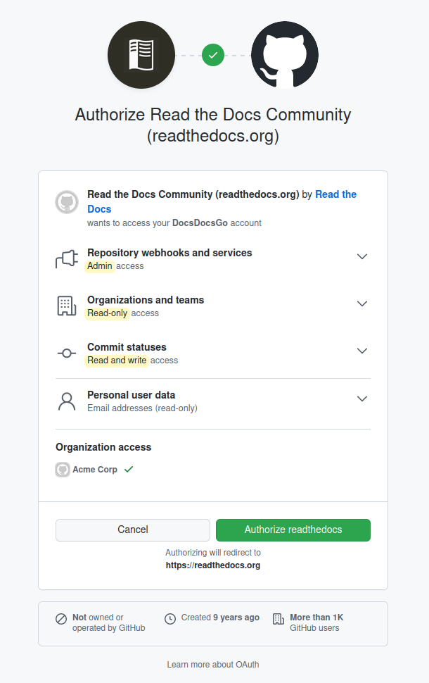 From here, you’ll be able to connect to your GitHub, Bitbucket, or GitLab account. This process will ask you to authorize an integration with Read the Docs.