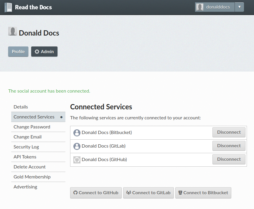 After approving the request, you will be taken back to Read the Docs. You will now see the account appear in the list of connected services.